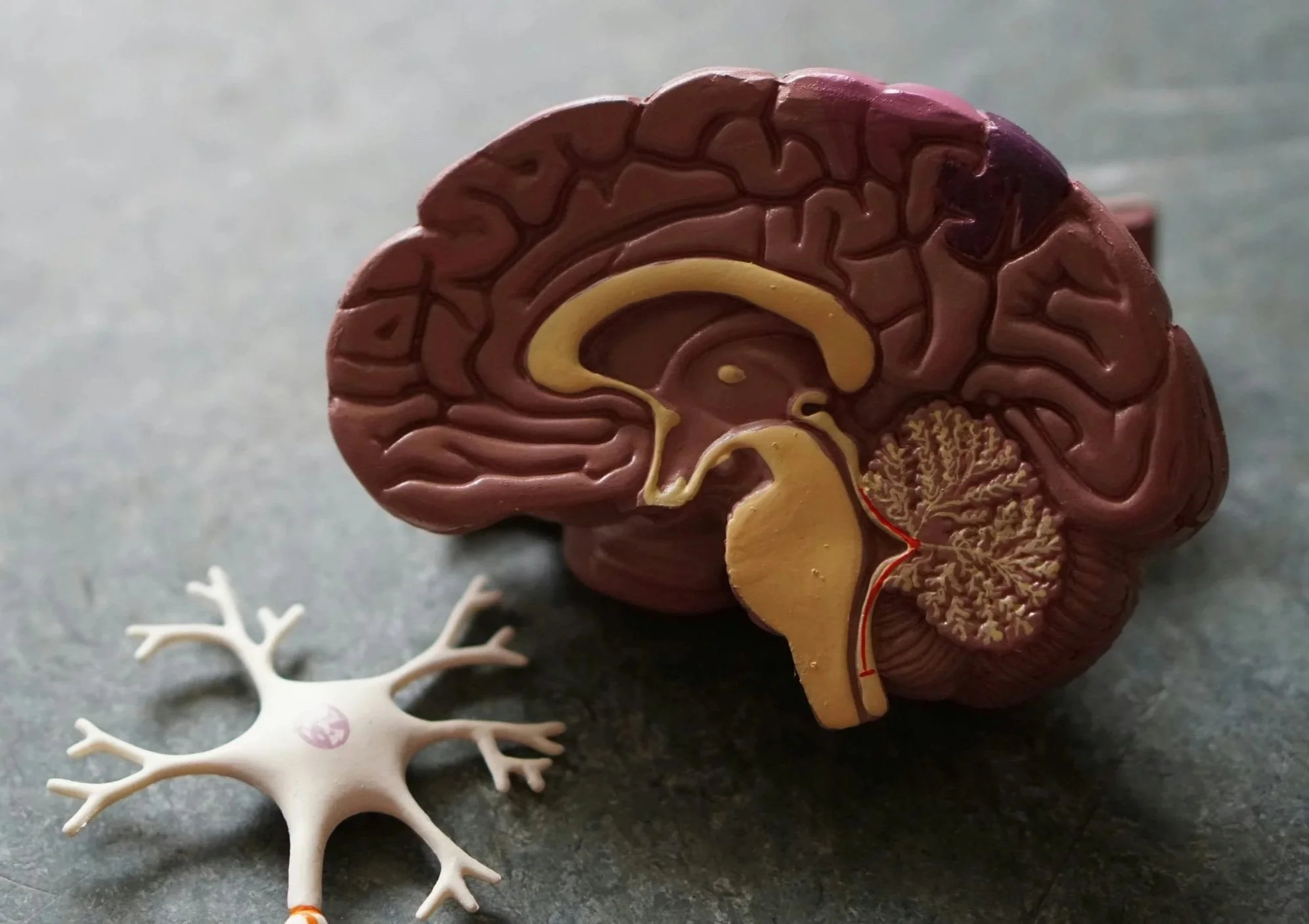 En modell av en menneskelig hjerne og en liten hvit hjerneformet gjenstand på en grå overflate. Foto.